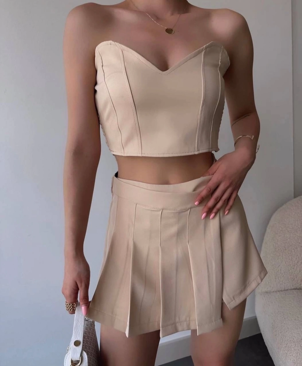 Arkadan büzgülü esnek büstiyer bej, kadın giyim kategorisindeki bluzlar arasında şıklık ve konforu bir araya getiriyor. Bu özel tasarım, hem günlük hayatta hem de özel davetlerde rahatlıkla tercih edebileceğiniz bir parça olacak.