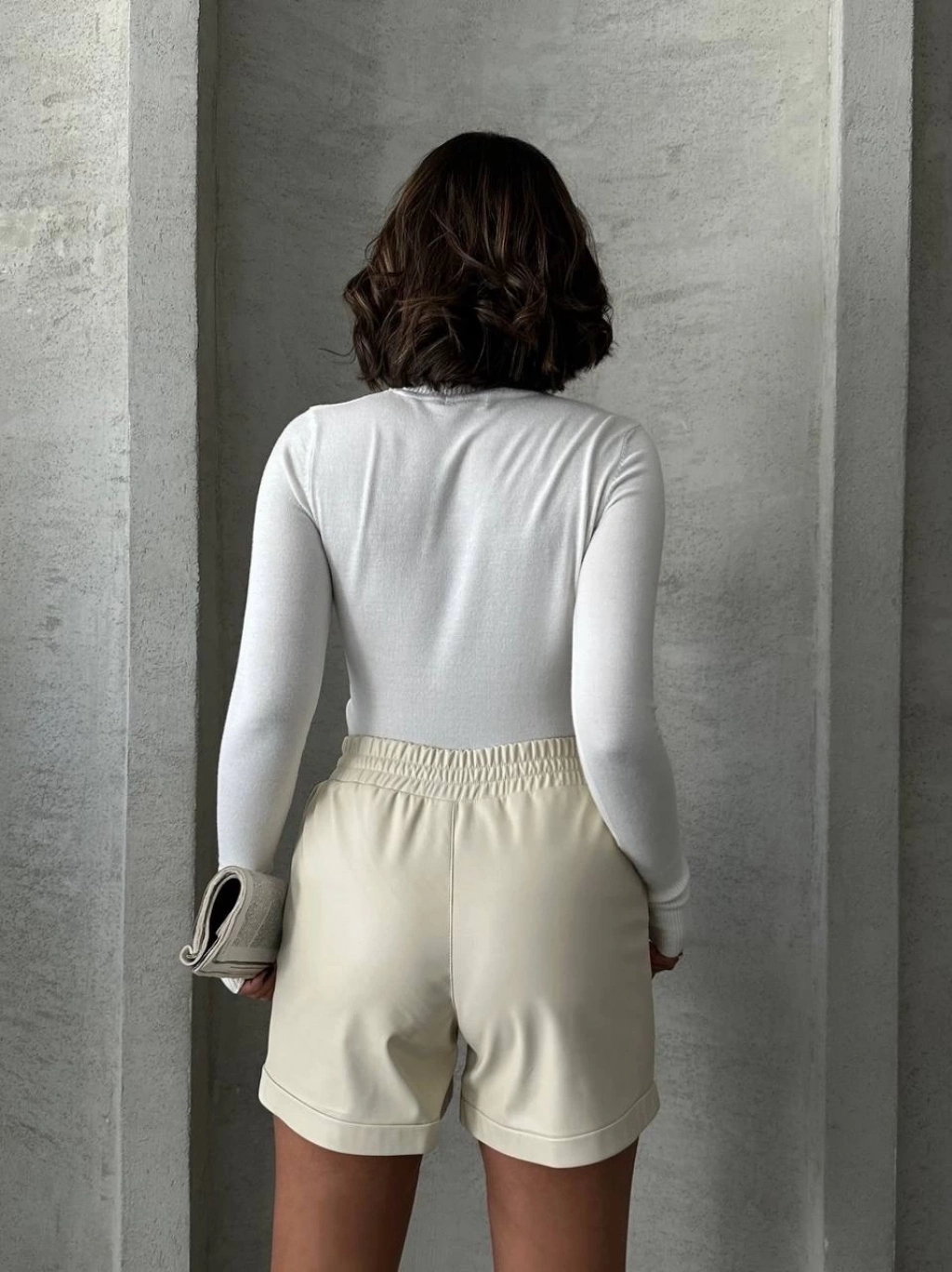 Beli lastikli çıtçıtlı deri şort krem w241007