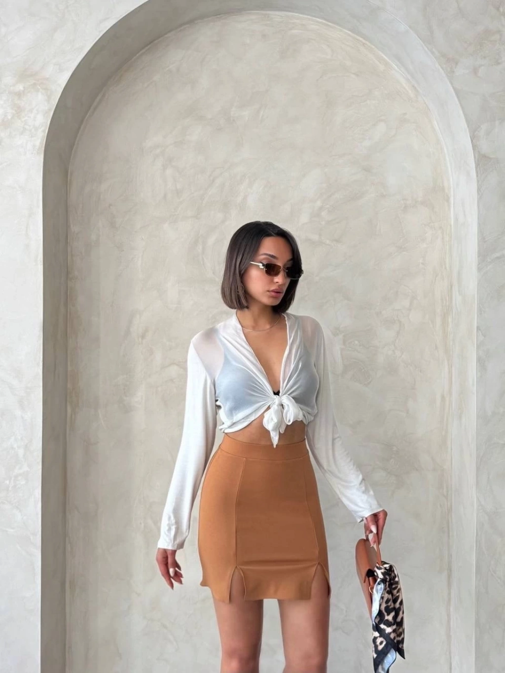 Çift yırtmaçlı etek camel s25910, şıklığı ve rahatlığı bir arada sunar.