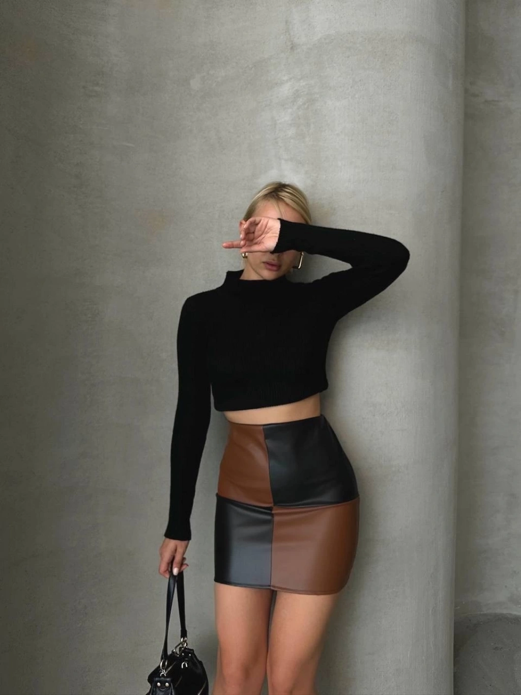 Damalı deri etek siyah ve kahve çift renk karışımı ile orijinal kuzu derisidir yumuşak bir yapıya sahiptir aynı zamanda az da olsa esnektir ve vücuda oturur normal günlerde ve özel günlerde tercih edilebilir bir parça dolabıınızda bulunması gereken parçalardan biri