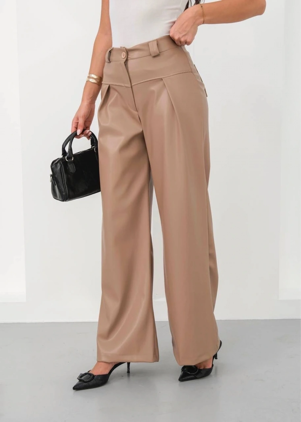 Deri geniş paça beli lastikli pantolon bej h263644, hem şık hem de rahat bir seçenektir. İşte bu pantolonun öne çıkan özellikleri: