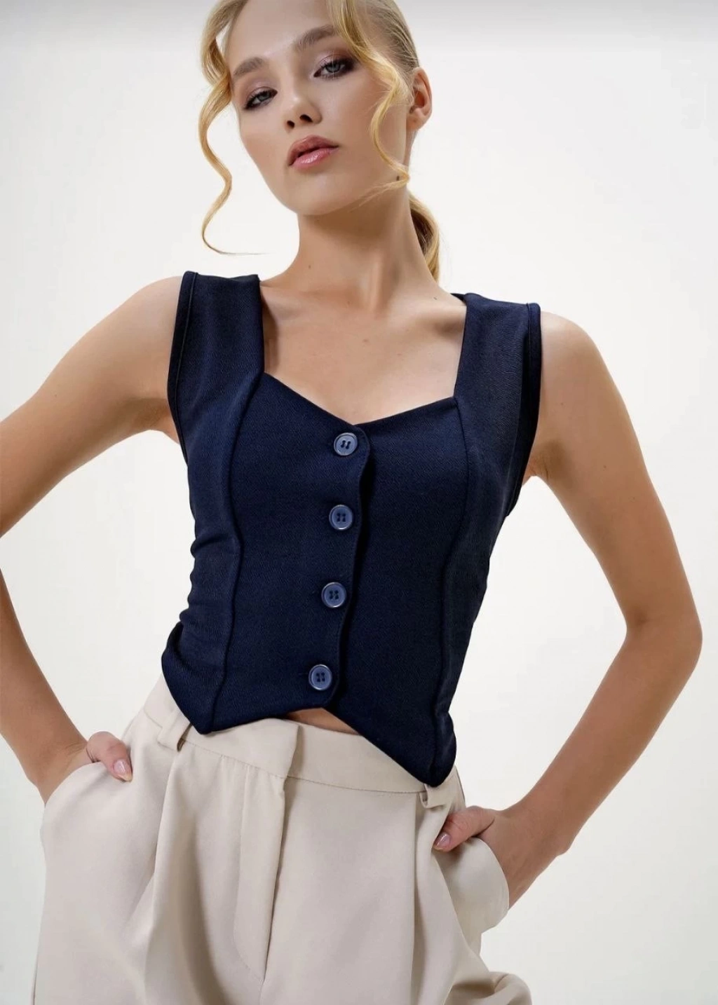Modaya uygun tasarımı ve pratik kullanımıyla Krep Kumaş Düğmeli Yelek Lacivert S3395, kombinlerinizi tamamlamak için ideal bir seçenektir.