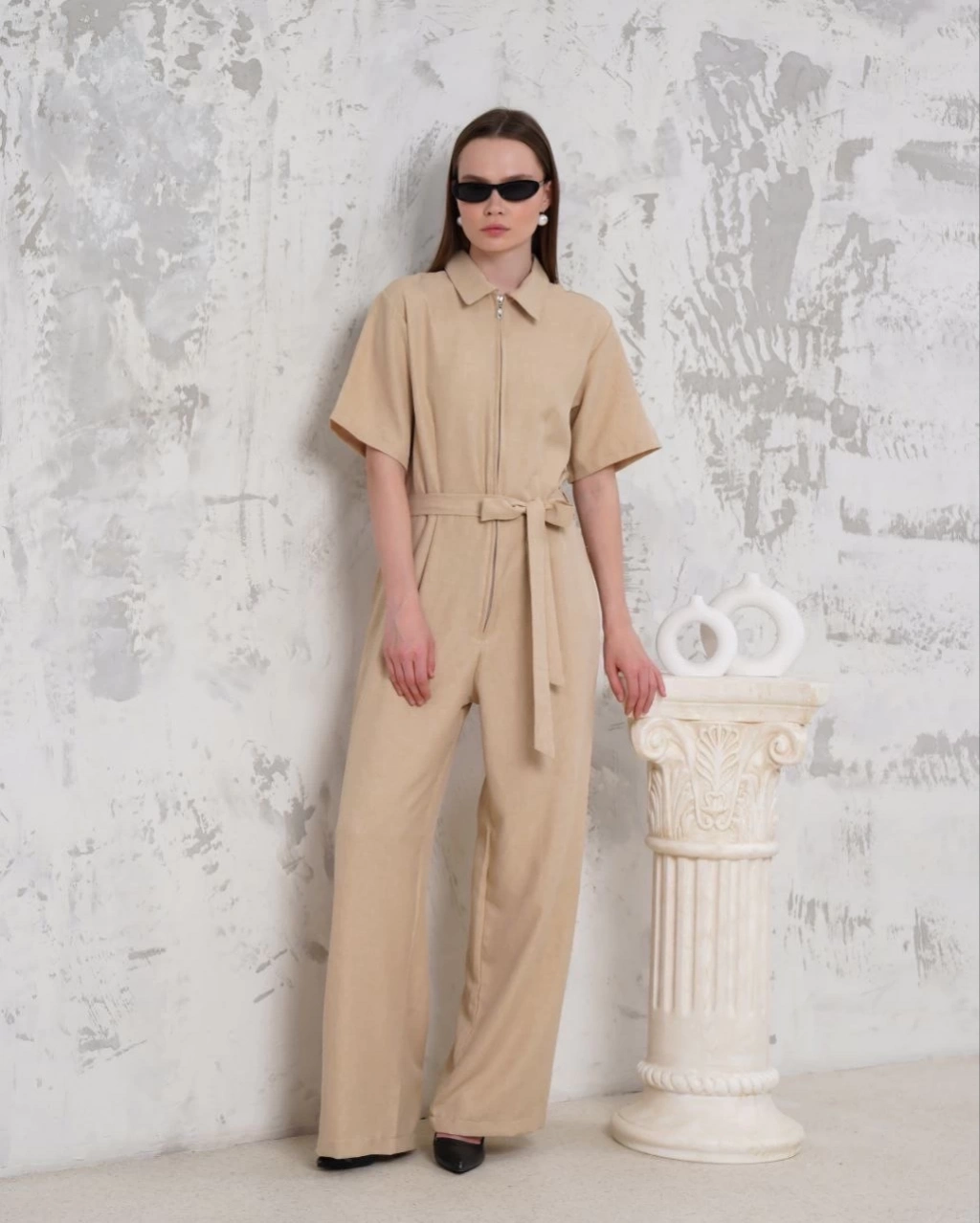 Kuşaklı gömlek yaka salaş tulum bej s255822