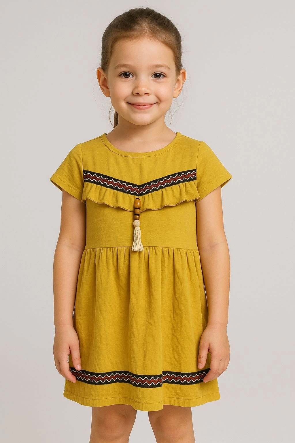 Önü püsküllü boncuk detaylı kız çocuk elbisesi hardal