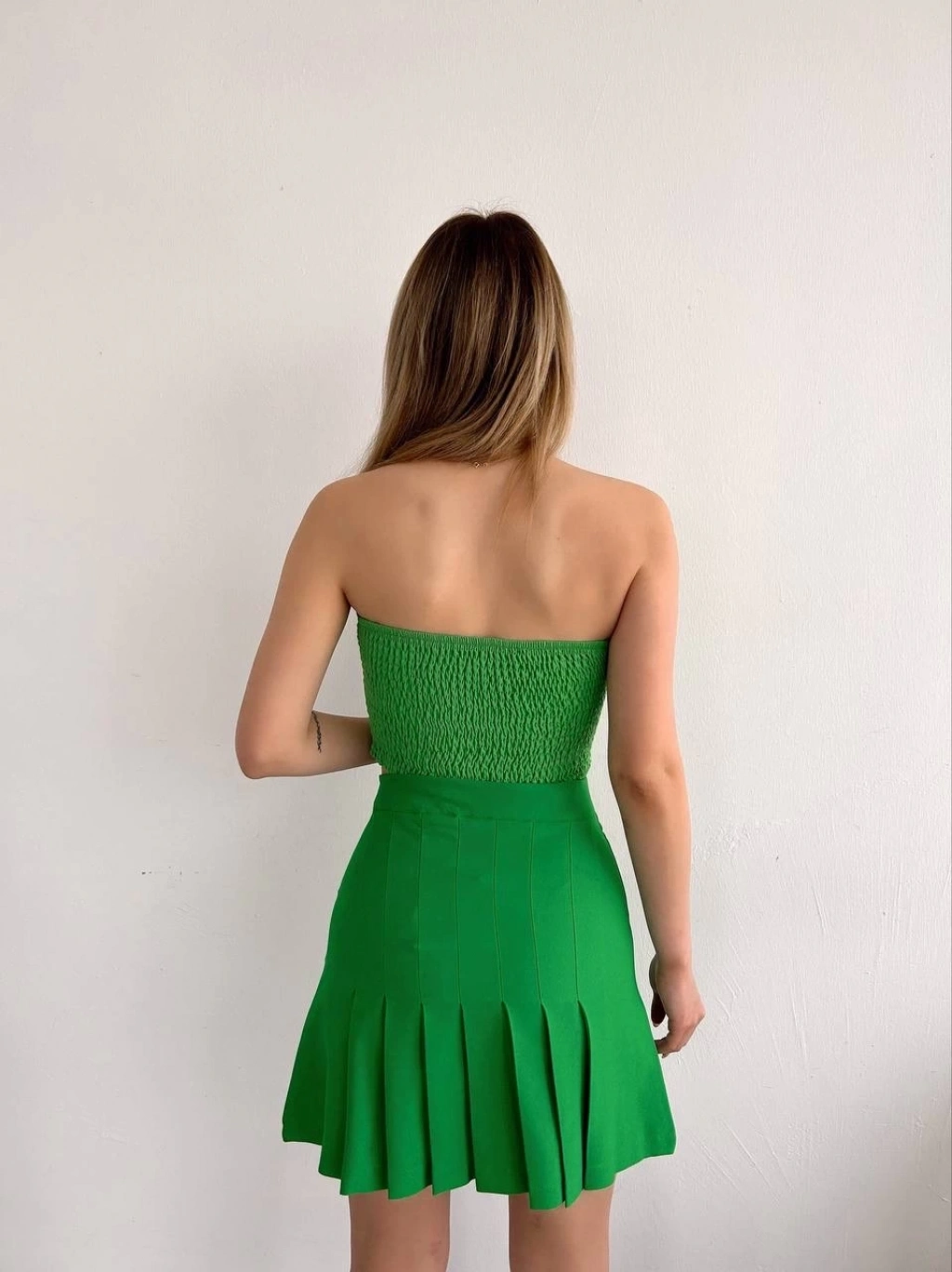 Açık yeşil rengi ile doğanın tazeliğini yansıtan bu etek, her mevsim kolaylıkla kombinlenebilir özelliğiyle dikkat çekiyor.
